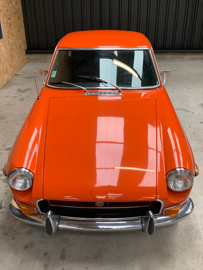 Pétillante MG B GT orange intérieur noir de 1972 dans un très bel état, entièrement révisée dans notre atelier, freins, disques avant, plaquettes, suspensions, amortisseurs neufs, CT vierge.