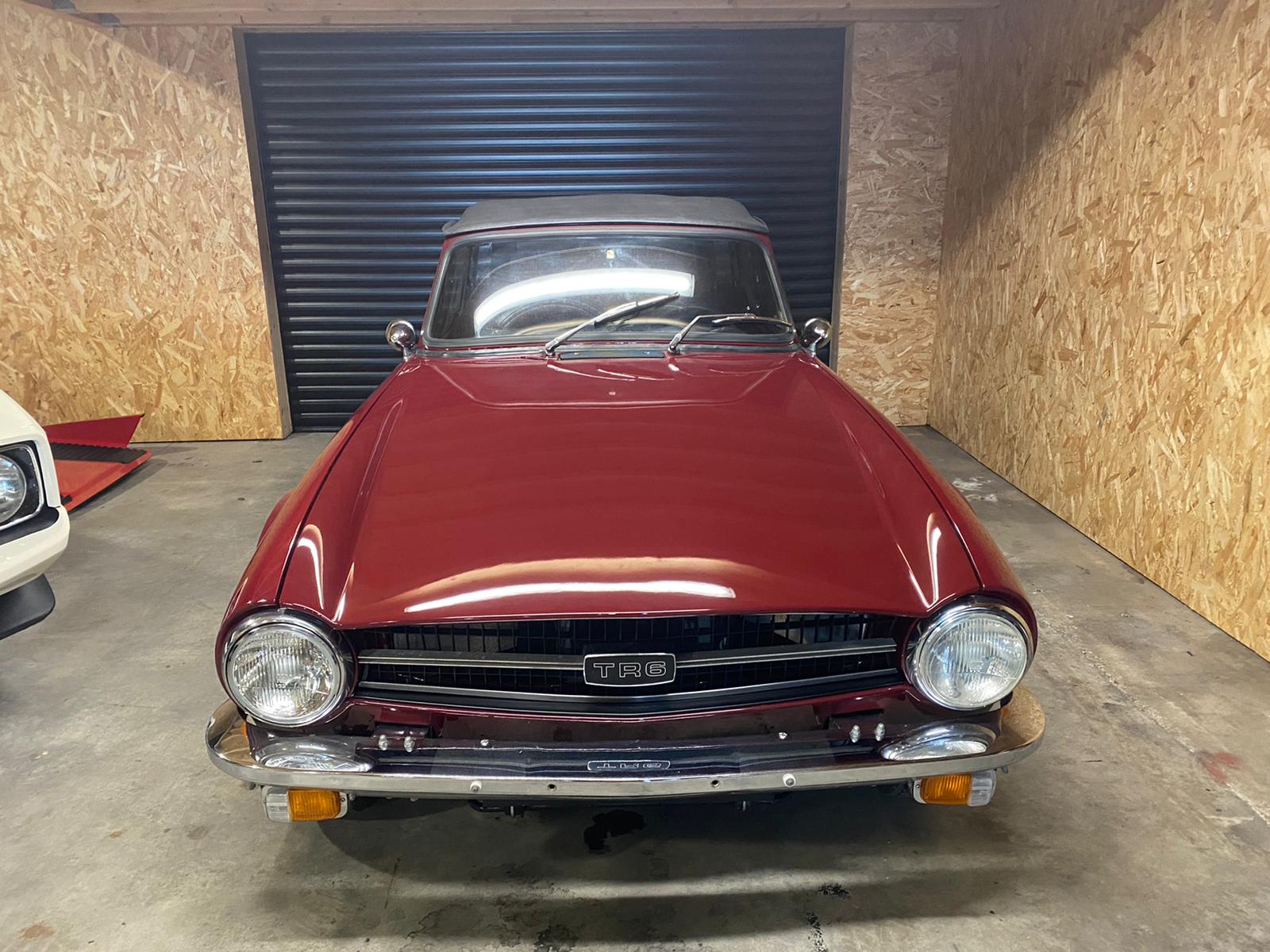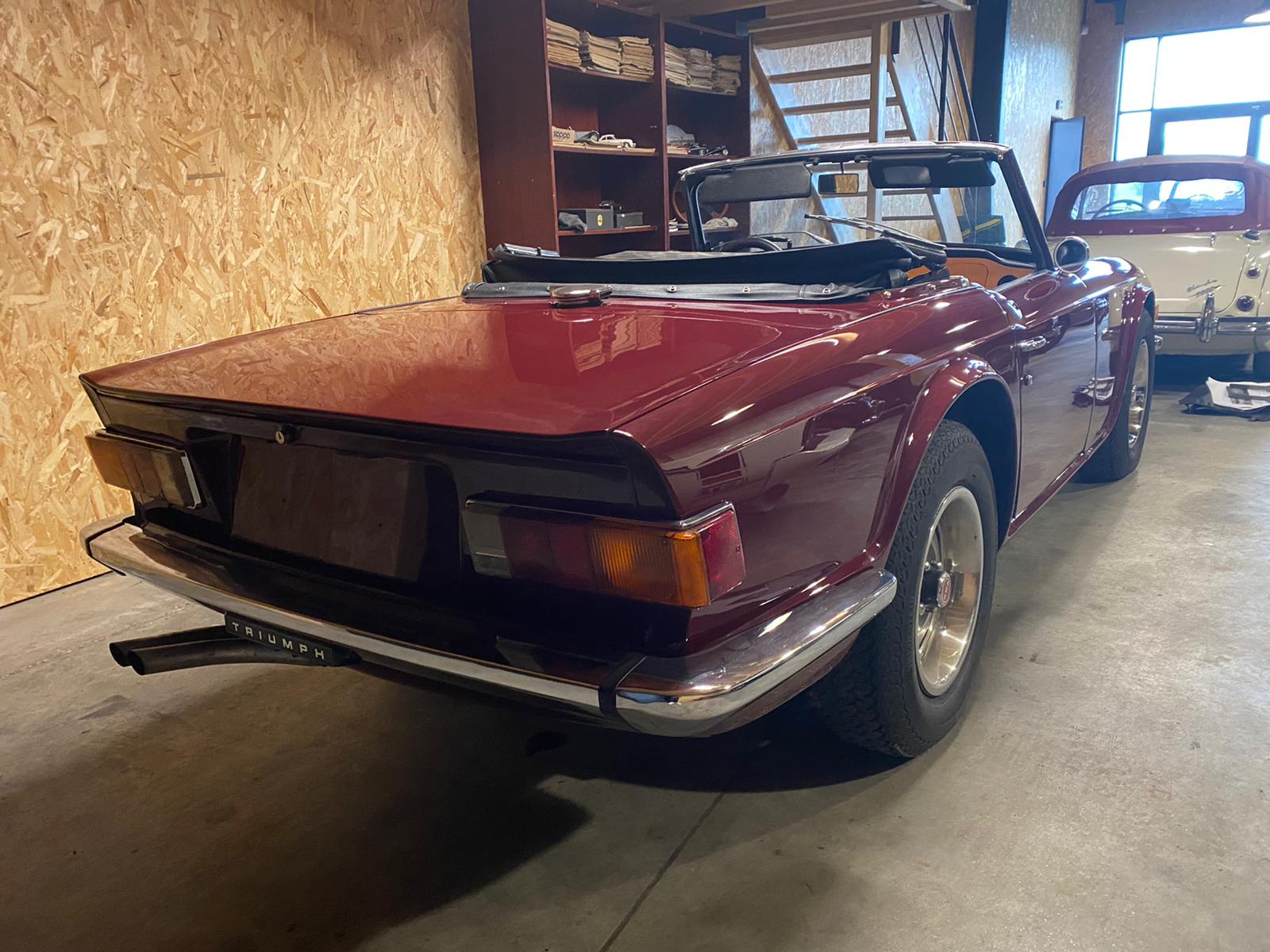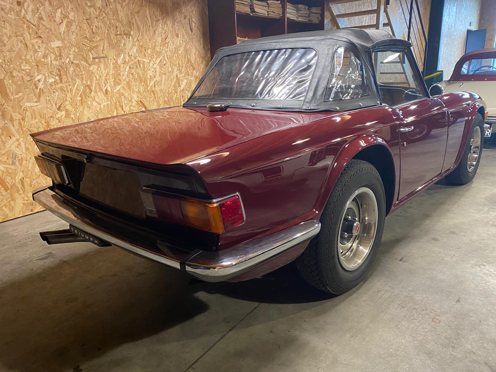 Triumph Tr6 carrosserie bordeaux intérieur noir.